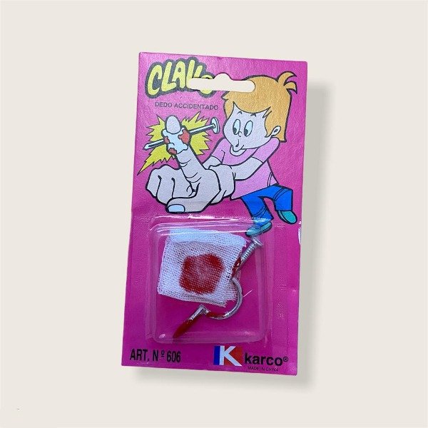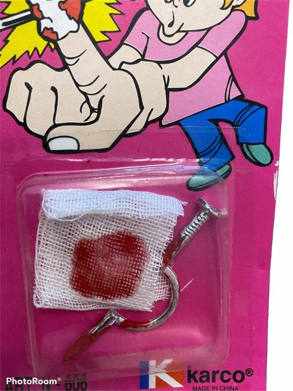Clavo con venda con sangre. Herida falsa que parece real. Buenísimo para hacer bromas y asustar a alguien.