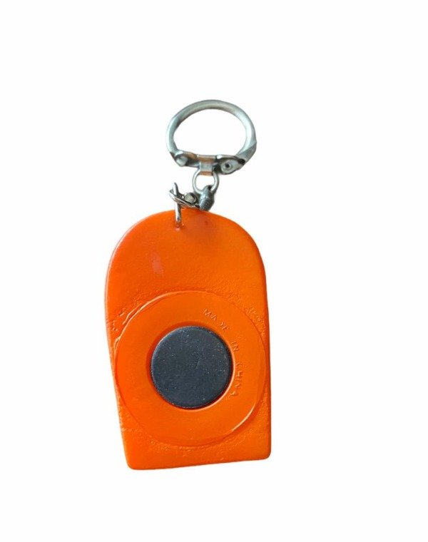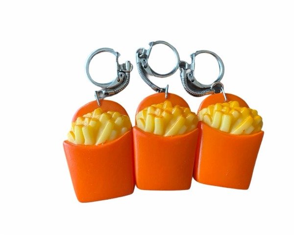 Es a la vez un llavero y un imán. Forma de papas fritas. Ideal para enganchar la llave al llavero y luego dejarlo con el imán en la heladera.