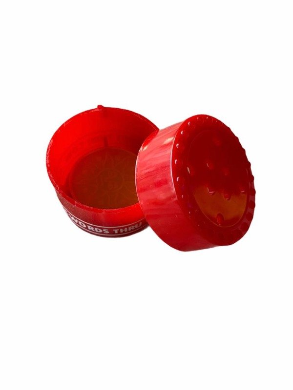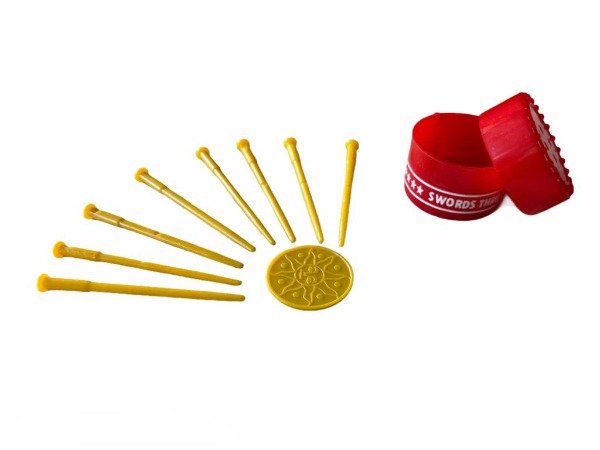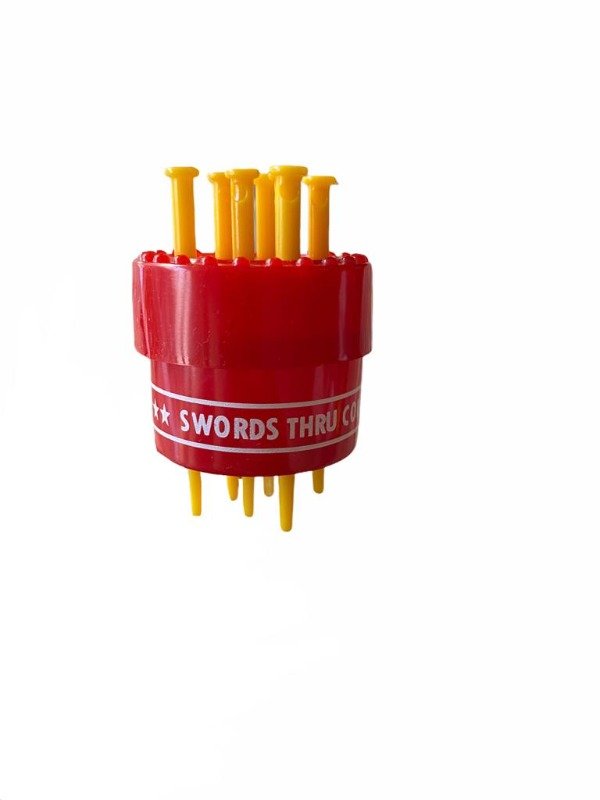 TRUCO: El mago coloca la moneda en el tarro rojo y lo cierra. A continuación se colocan las espaditas amarillas por los agujeros y atravesaran la moneda ante los ojos de todos. Luego las espada se extraen una a una y la moneda queda intacta dejando al público asombrado.
